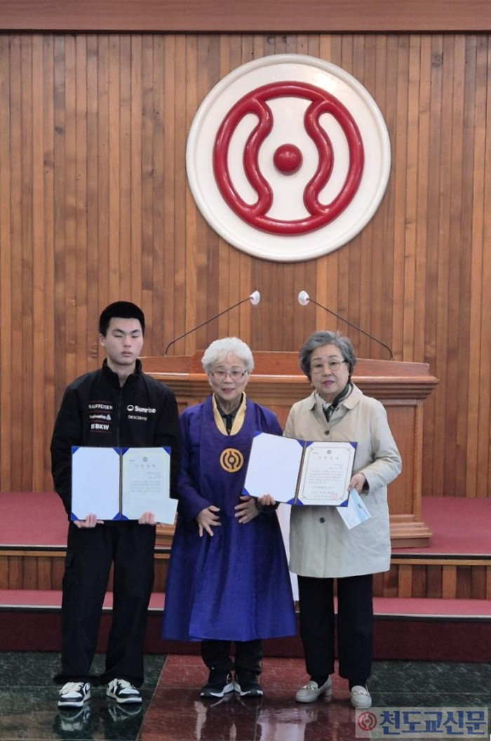 2025년(포덕 166년) 장학생으로는 해운대고등학교 1학년 김태현 군(좌측)과 부산대학교 1학년 장시현 군이 선발되었다.(이날 수여식에는 장시현 군의 조모가 대리 수여받았다)