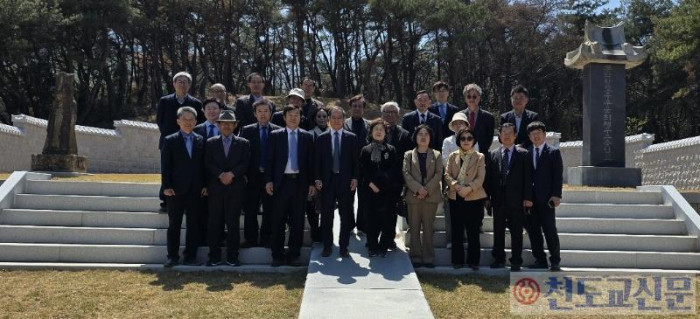 면담을 마치고 기념사진을 촬영하는 모습. 왼쪽부터 문범식 전서실장, 이국진 감사원장, 정정숙 종의원의장, 김성환 연원회의장, 주낙영 경주시장, 박인준 교령, 내수도 정숙례, 강병로 종무원장, 김혁태 종학대학원장, 최상락 용담수도원장, 성주현 상주선도사